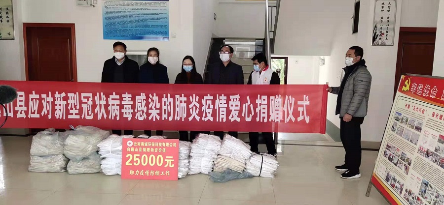 云南海诚环保企业理事会在事件发生后及时做出积极反应,在牢记公司使命的同时,充分保护员工的安全和健康,积极为社会防疫贡献力量。 在得知全省指定新型冠状病毒医院一线医护人员严重缺乏防护用品的情况后,2020年2月2日起公司行政、党支部非常热心的对接协调,安排支部党员、公司职工多线筹措聚集医用物资、并向海外朋友寻求帮助,短短10天,聚齐了很多的防护服、隔离服、口罩等防护用品各自捐向大理州祥云县红十字会、大理州抗击新型冠状病毒指挥部、大理市红十字会、大理州巍山县红十字会、昆明市西山区红十字会赠送。在这个时候公司还整理好了次氯酸钠消毒液,一起送到了宾川县鸡足山镇和力角镇、永平县厂街乡等乡镇,支援抗疫一线。截至2月13日,一共为抗击新型冠状病毒捐赠了很多的物资。